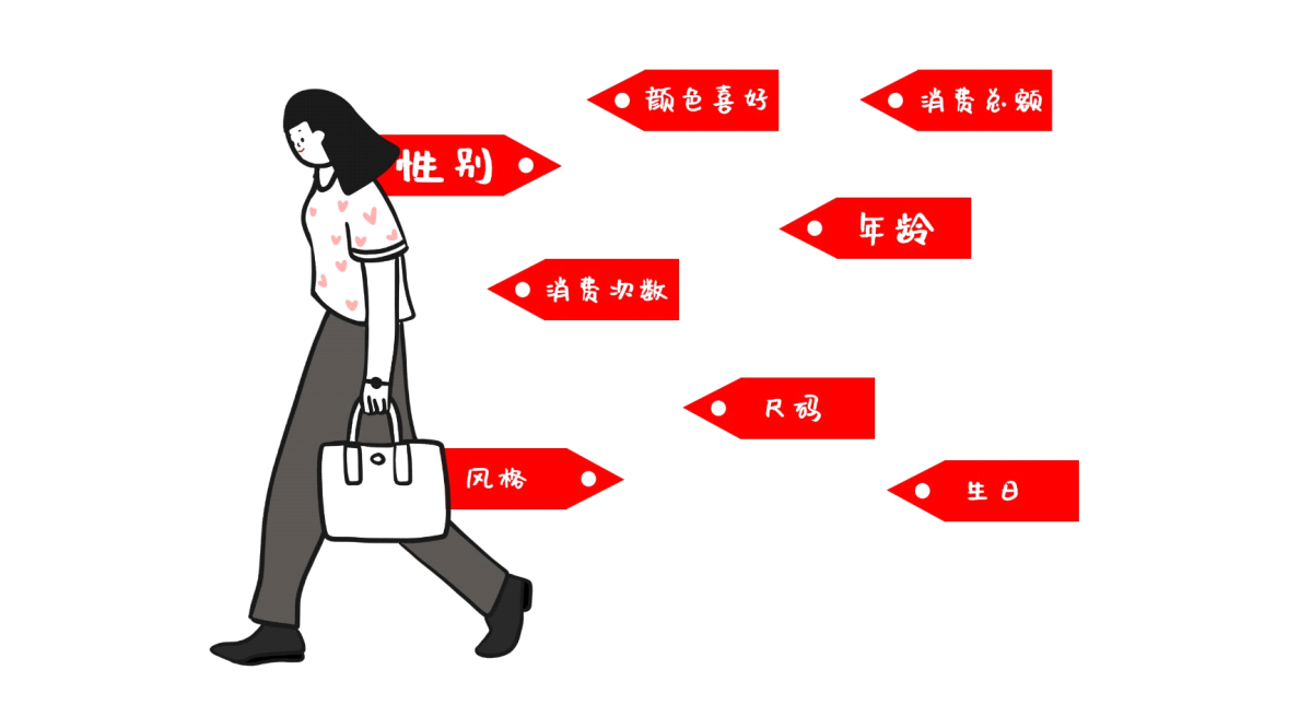如今:算法可以通过门店的会员信息来进行数据收集和特征提取,将其分为不同的客群属性,包括性别、年龄、生日等人群自然属性,尺码偏好、颜色偏好等商品偏好属性,消费次数、最高单价等消费行为属性,及流失、忠诚、价值等RFM属性。在这几个属性下,各个特征进行组合构建出多种“消费者标签”,进而形成了会员画像。