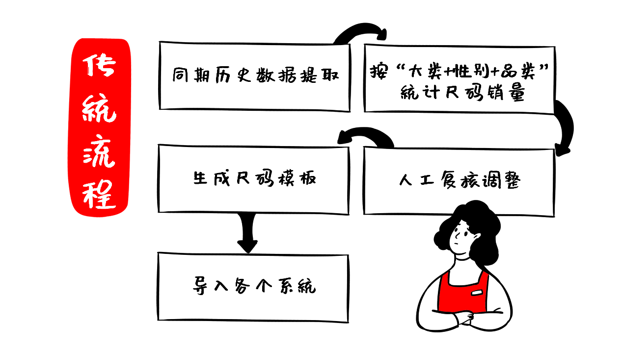以往:每个地方的消费偏好和尺码需求都有所区别,传统的收集方法往往依赖于商家自身的经验,会有一定的偏差,如店长日常的缺码反馈、同期的尺码售卖比例、标准的一手码比例等。