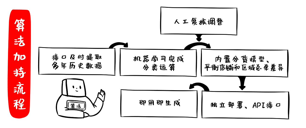 如今:算法加持的零售系统可以根据数据特征搭建一整套的预测模型,小到预测每一阶段每个款型、尺码的销量,大到预测单个渠道的总销量,实时输出结果。并以此为依据,进行快速地调补货、下单生产、营销促活等等商品洞察和运营动作。举个例子,当商家门店的某款服装每天都有一定的客流量且不断增长,算法立刻就能收到风声,将其销售量放进自己的模型中,再配合季节、节日及其他因素,预测出这款服装的销量在未来是否依旧为上升趋势,从而告诉商家是否需要抓紧补货。