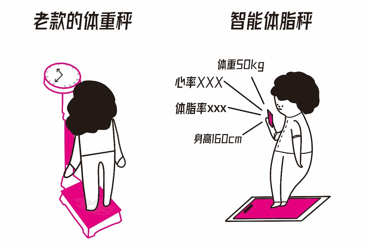 之前,小美妈妈去药店买药时,每次都会在店内的杠杆秤上称下体重,获取自己的体重信息。最近小美妈妈开始运动健身,为了监控健身效果,她买了一个体脂秤,每天都测一下。体脂秤会准时把小美妈妈的身体数据进行语音播报,并通过蓝牙传输到了手机APP上:体重50kg、身高160cm、体脂XXX……