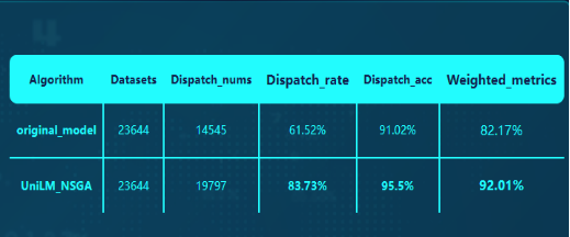 该解决方案拥有具备有效性、创新性和应用性的算法。该算法拥有统一预训练模型和nsga的多目标算法派单方案,在某地的实际应用中,最终的派单率由61.52%提高到83.73%,派单准确率由原来的91.02%提高到95.5%,算法综合准确率由原始的82.17%到当前的92.01%。