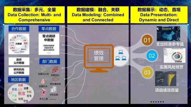 构建预算绩效数据反应堆,通过收集和整合多元的数据,把资金数据与项目数据、财政部门数据与预算单位数据、政府数据与社会数据等数据进行归集。