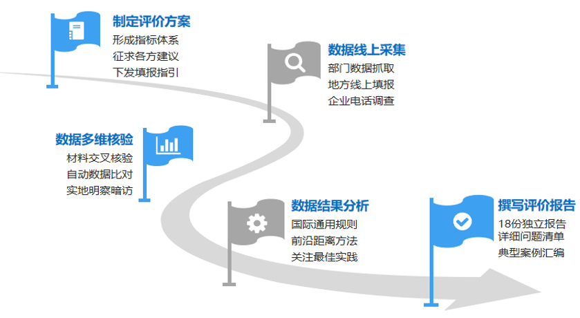 本项目共分为制定评价方案、数据线上采集、数据多维核验、数据结果分析和评价报告撰写等5个工作步骤。