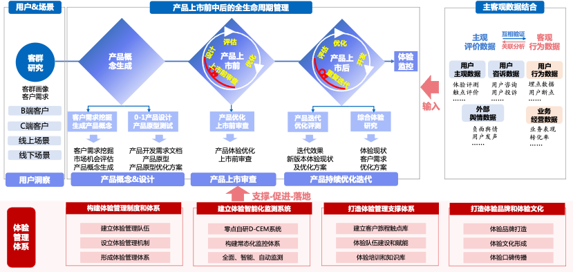 该解决方案从用户和场景出发,针对产品上市前、中、后期形成设计-评估-优化-迭代的闭环管理,并通过主客观数据结合、数智化系统推动、全方位的体验管理机制形成落地策略。