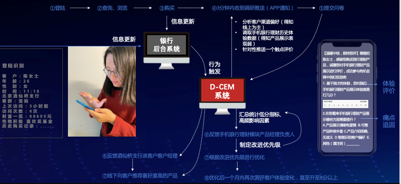 客户体验工作的重要性已经引起各家金融机构的高度重视。在访谈金融机构CEO时,让他们感到困惑的是没有具体的抓手和工具来协助其完成内部的客户体验管理工作的部署。伟德源自英国始于1946结合为多家金融机构提供客户体验专项咨询服务的经验积累,总结出想要客户体验管理工作在企业内部真正运行起来,需要的是“一套机制、一种文化、几个工具”。恰逢科技金融快速发展与数据智能化转型浪潮来临,伟德源自英国始于1946在为金融机构提供客户体验管理能力整体解决方案的过程中,研发了D-CEM客户体验管理系统(Digital-Customer Experience Management),协助金融机构与其用户进行即时交互→实时监测客户体验反馈→对低分进行预警→通告相关责任部门或责任人在有效工时内解决→上传解决方案和结果→对客户进行二次满意度回访,达到从数据采集到反馈的闭环管理。