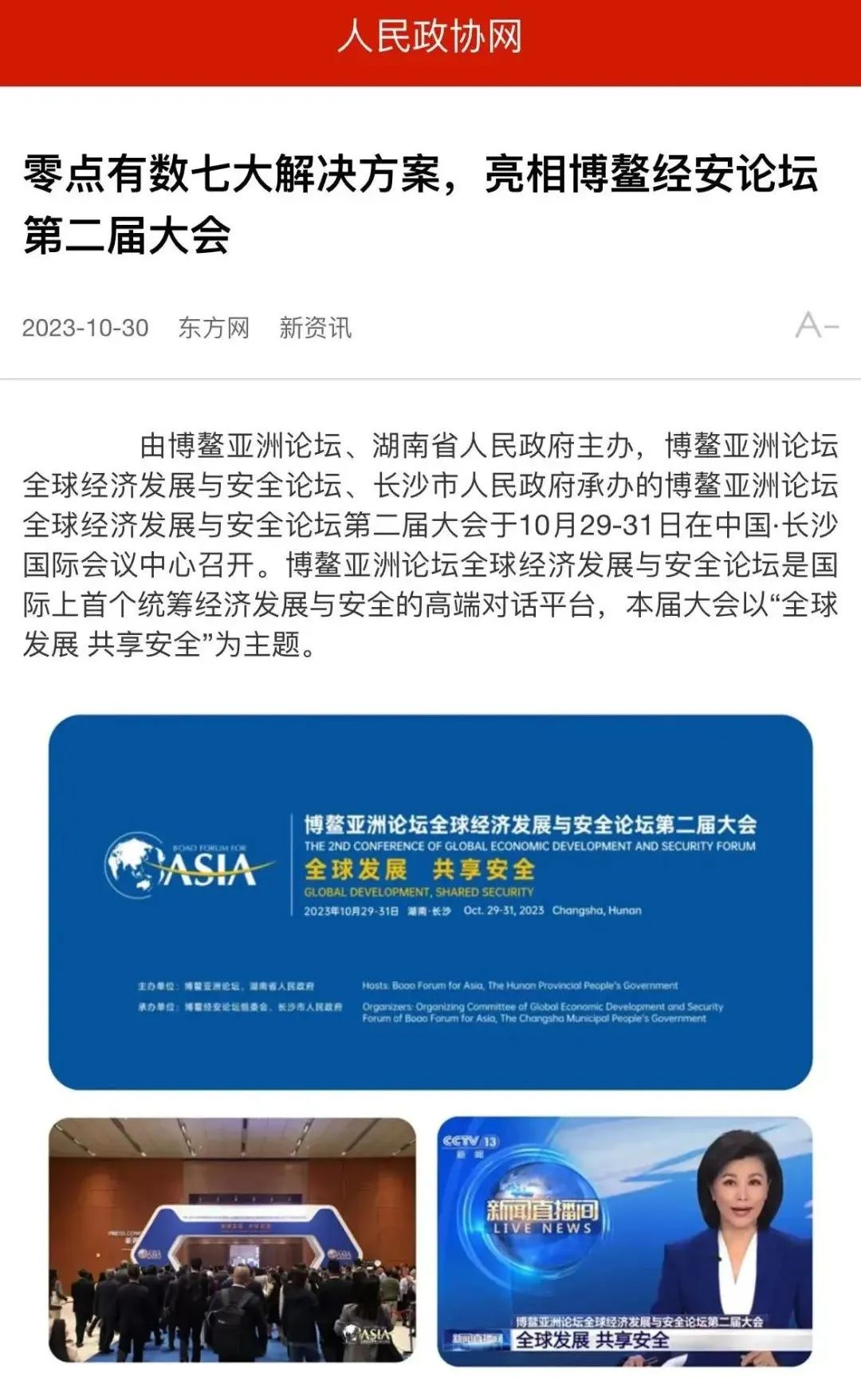 由博鳌亚洲论坛、湖南省人民政府主办,博鳌亚洲论坛全球经济发展与安全论坛、长沙市人民政府承办的博鳌亚洲论坛全球经济发展与安全论坛第二届大会于10月29-31日在中国·长沙国际会议中心召开。本届大会以“全球发展,共享安全“为主题。博鳌亚洲论坛全球经济发展与安全论坛是国际上首个统筹经济发展与安全的高端对话平台。