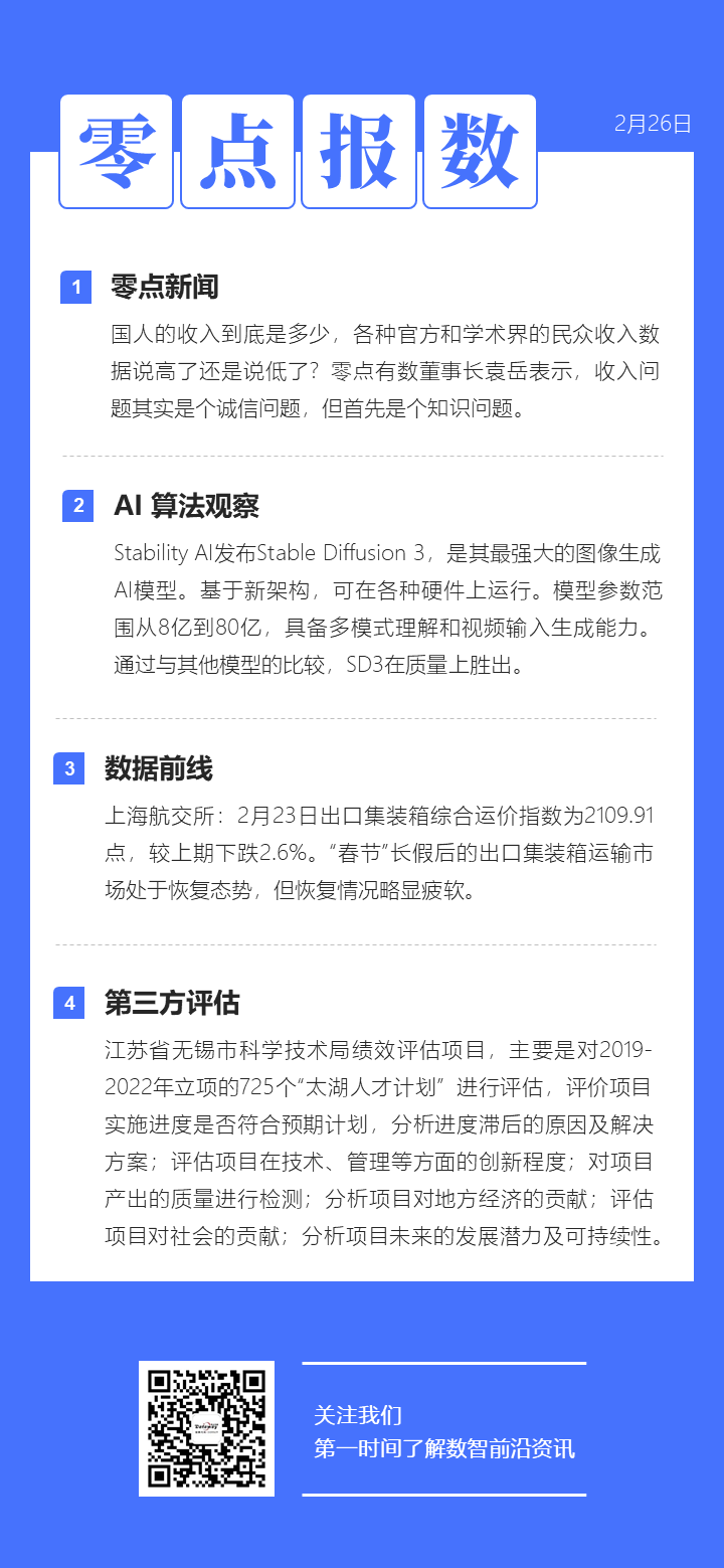 图像生成AI模型Stable Diffusion 3发布;2月23日出口集装箱综合运价指数为2109.91点丨零点报数