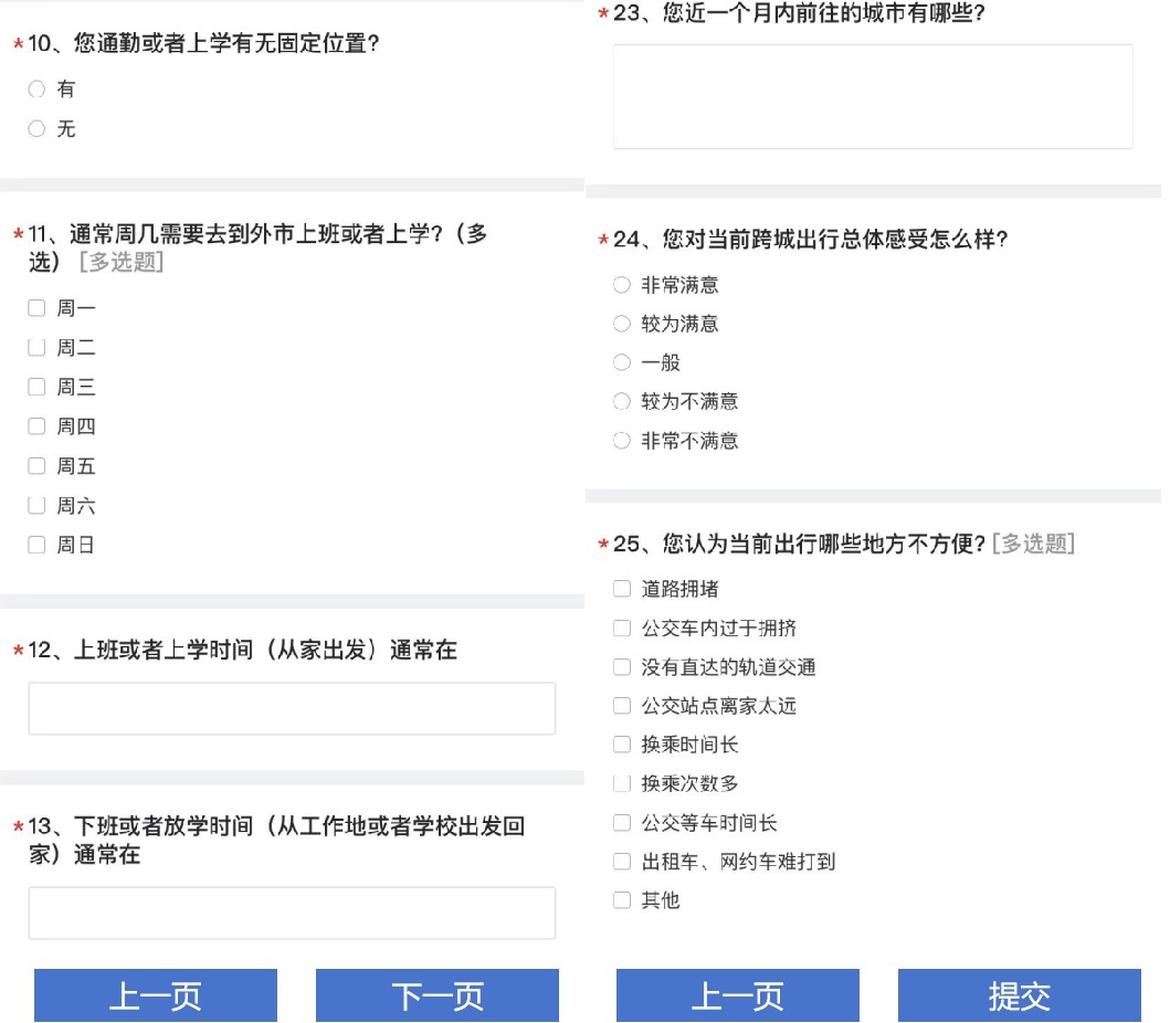 主要包括家庭信息、个人信息、出行目的筛查、通勤/通学调查、其他出行目的调查、满意度调查等内容。同时,结合运营商手机数据和互联网地图位置服务数据,获得城市人口居住地、就业地信息以及城市间交通出行特征。并同调查数据进行交叉验证、融合分析。
