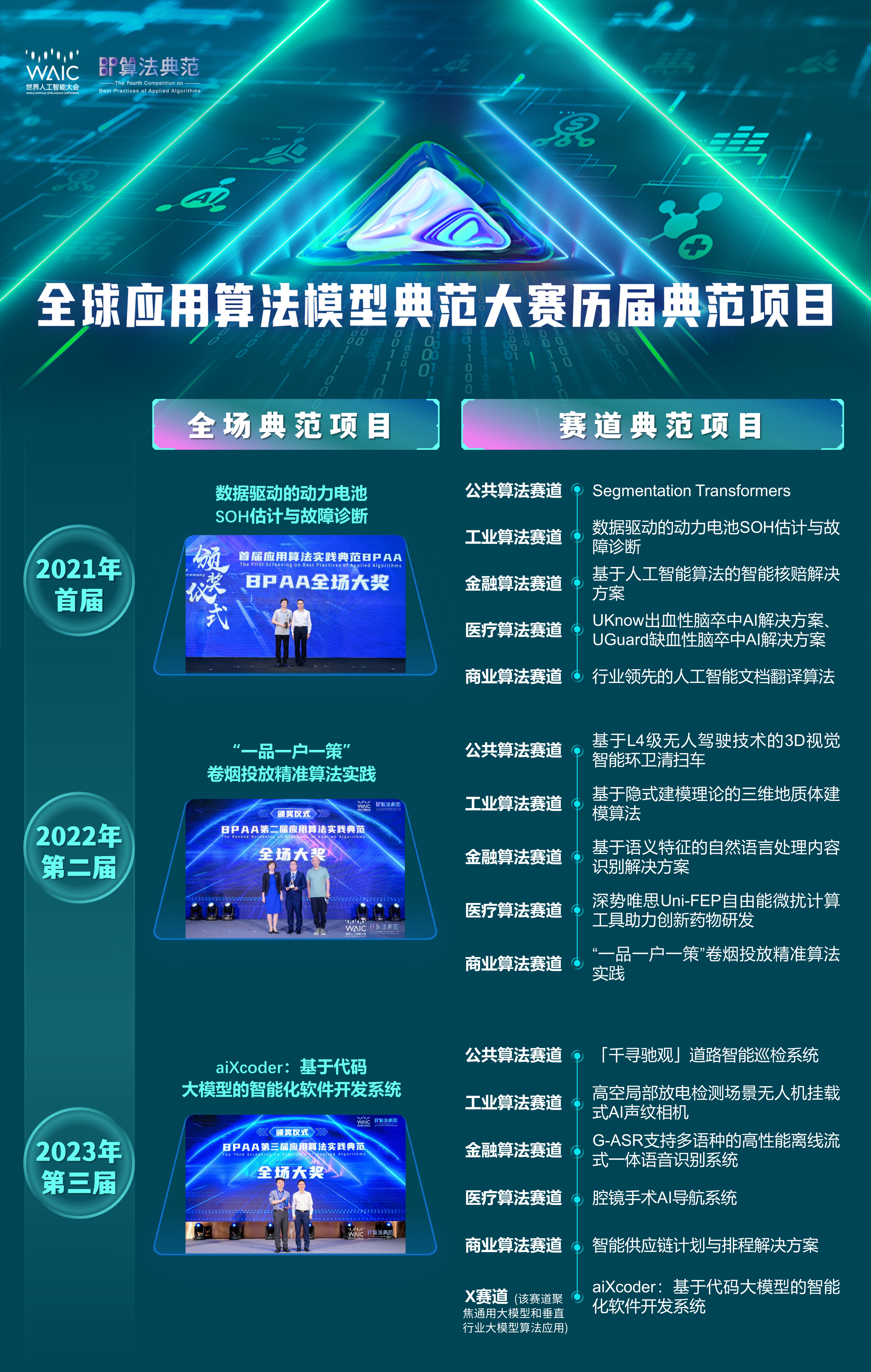 BPAA大赛作为世界人工智能大会四大品牌赛事之一,已连续举办三届。在过去三年,大赛共汇集全球15个国家60多个城市700多支团队参与大赛角逐,大赛每年发布应用算法典范TOP50榜单,涉及公共、工业、金融、医疗、商业等多个领域,形成了应用算法先进案例库。作为每年各主流媒体关注的焦点,BPAA大赛共计获人民日报、人民网、新华网、光明网、中国新闻网、环球网等国内权威媒体报道近1500篇,海外媒体关注并报道超600篇。去年在第三届BPAA大赛上,顺应GPT时代背景,以大、中、小模型为切入,特设通用大模型和垂直行业大模型算法应用赛道(X赛道),亦是走在了关注大模型创业项目的赛事前列。
